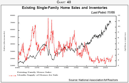 b. Watch the housing inventory – sales ratios. This ratio is usually a leading indicator. What I think that means is that the ratio will change quickly at the first sign of trouble and not lag an economy. Unrelated to Shilling, I found this site, which kind of says similar things. http://www.investorsinsight.com/otb_va_print.aspx?EditionID=256 Here are some charts from that link. The charts below show very much the same data. Gary’s data was from Mortgage Bankers Association of America.